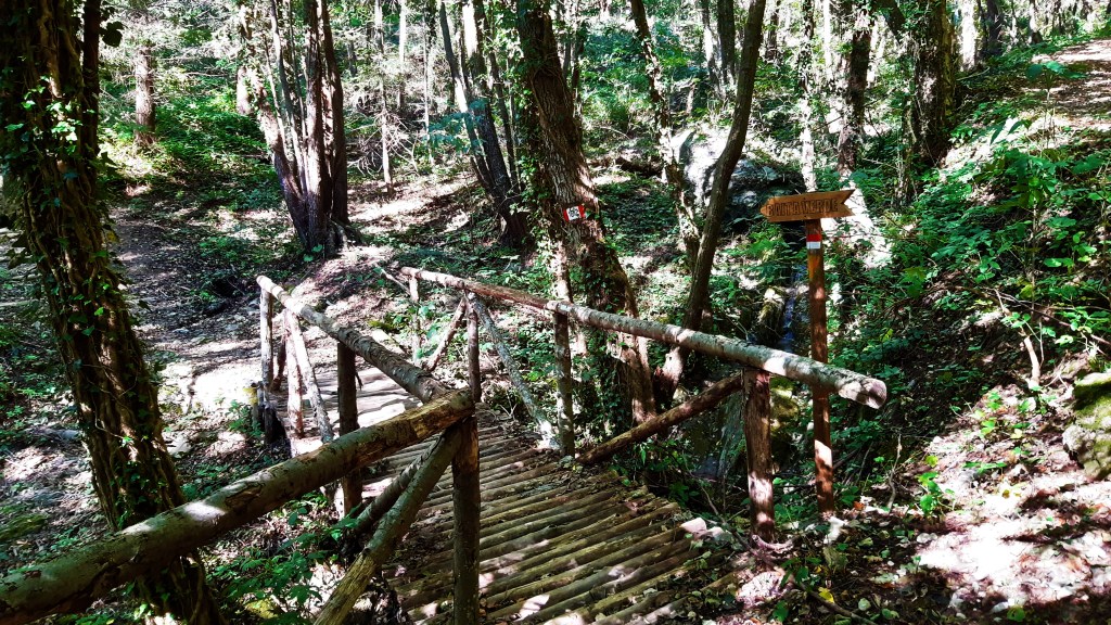 Quindi, dopo aver attraversato un ponte di legno, il sentiero si inerpica ripidamente in un bosco di castagni.